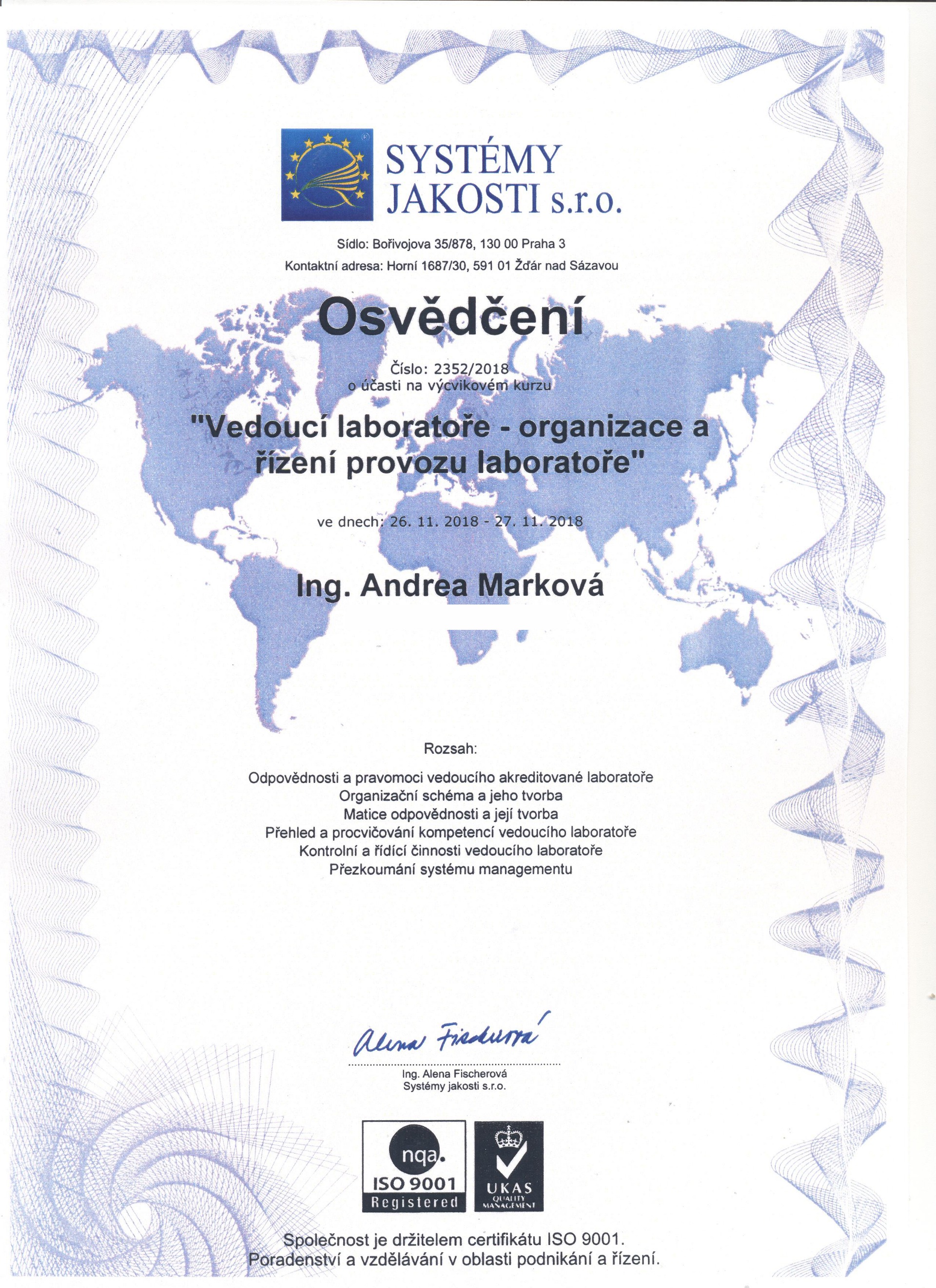 Osvědčení o správné činnosti laboratoře